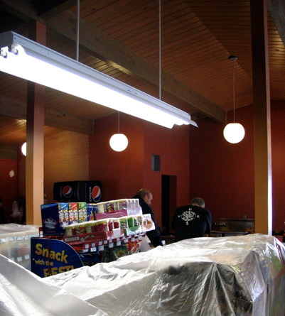 The wall with the door opening and the wall to the left will be covered with corrugated tin which will be distressed a bit so it won't look shiny. All the light fixtures are to be switched out to industrial looking pendants.